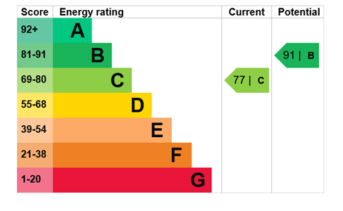According to the EPC valid until 28th September 2032 the property has an Energy Efficiency Rating of C77.
